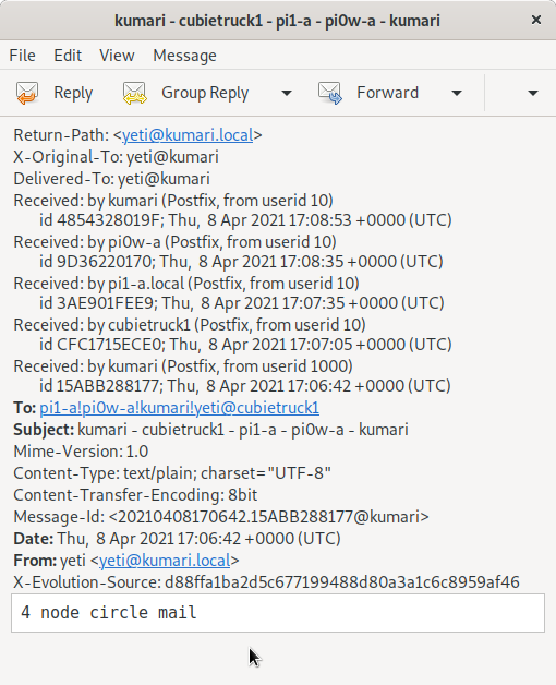 (yeti@kumari:1)~$ mail -s 'kumari - cubietruck1 - pi1-a - pi0w-a - kumari' 'cubietruck1!pi1-a!pi0w-a!kumari!yeti' <<< '4 node circle mail'