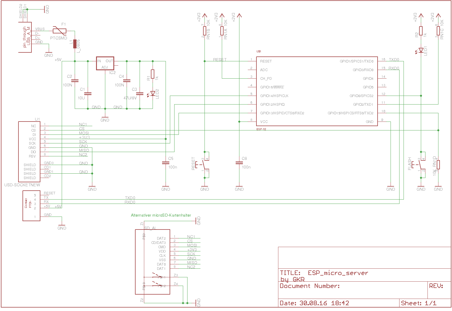 Ich stelle hier meinen Entwurf eines kleinen Webservers mit ESP-12F und microSD-Karte vor. Später, falls das Teil mal funktioniert kommen auch die Eagle-Dateien dazu. Es wird das ESP-12F-Modul verwendet aber nur der Footprint eines ESP-12 Moduls benutzt, da die zusätzlichen Anschlüsse nicht benötigt werden.