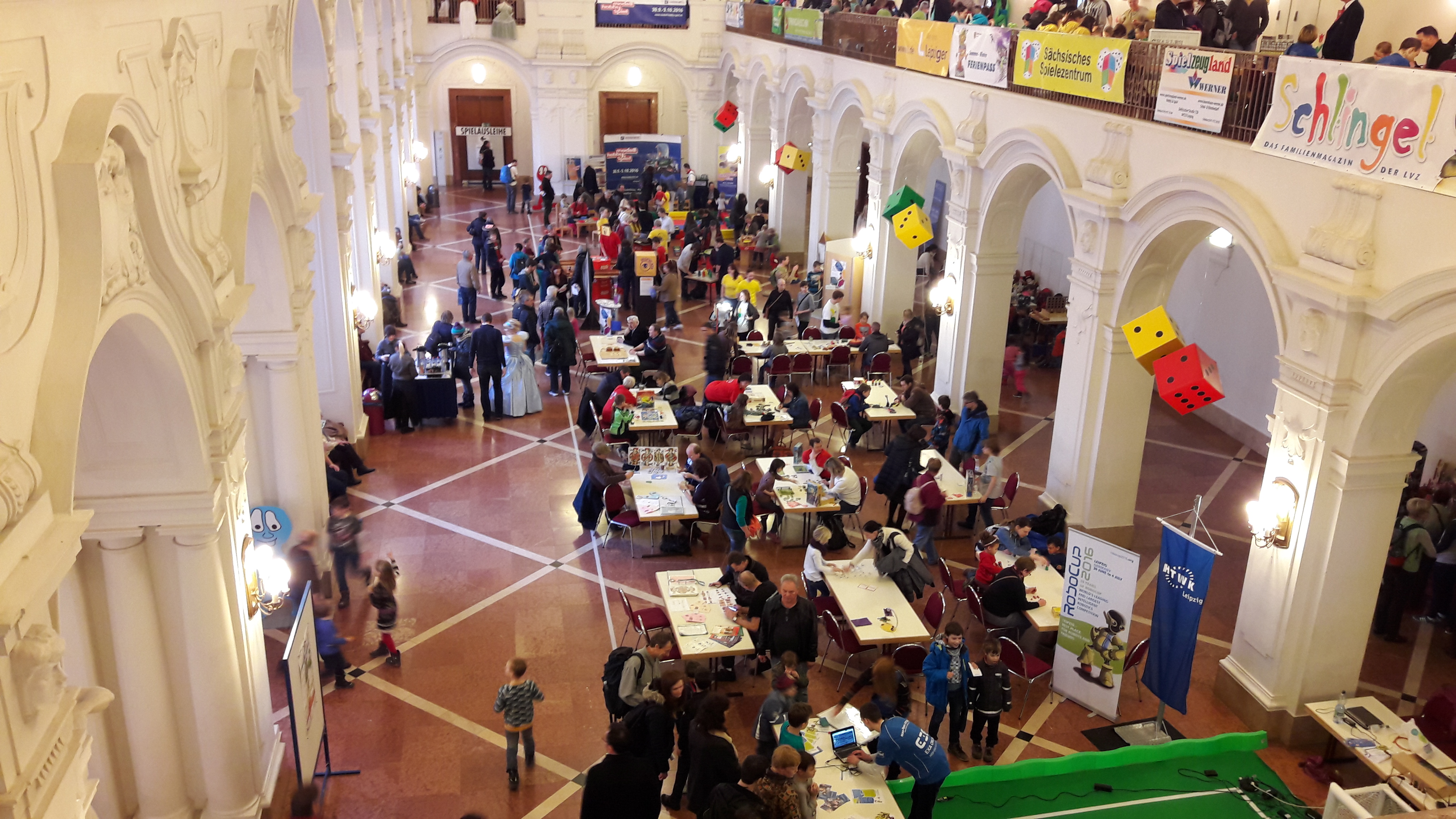 Das Leipziger Rathaus lädt zum 8. FamilienSpieleFest "Leipzig spielt" ein. Vereine und Institutionen bieten Hunderte von (überwiegend analogen) Spielmöglichkeiten auf vier Etagen, vor allem Brett- und Sportspiele.