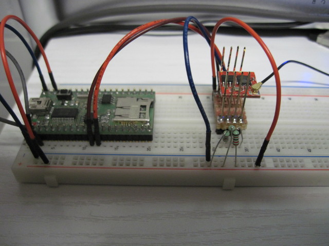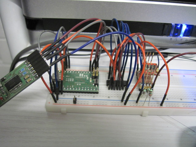 Ein Problem des ATmega328p ist das Vorhandensein nur einer seriellen Schnittstelle die 115200 baud bei 5V macht. Bei meinen Brotbrettmodulen hab ich normalerweise einen FT232RL aufgelötet, der untrennbar an dieser seriellen Schnittstelle hängt. Zum Glück hatte ich noch ein Modul wo dieser Chip noch nicht installiert war, weil ich dieses mal als seriell zu LCD Treiber mit 115200 baud verwendet hatte. So konnte ich gestern einen Versuch mit der Software der obigen Site machen. Als Levelshifter hab ich diesmal für die TX Leitung des Arduino den allseits beliebten Widerstandsteiler benutzt und die RX Leitung direkt mit dem TX-Ausgang des ESP8266 verdrahtet. Das sollte normalerweise genügen.