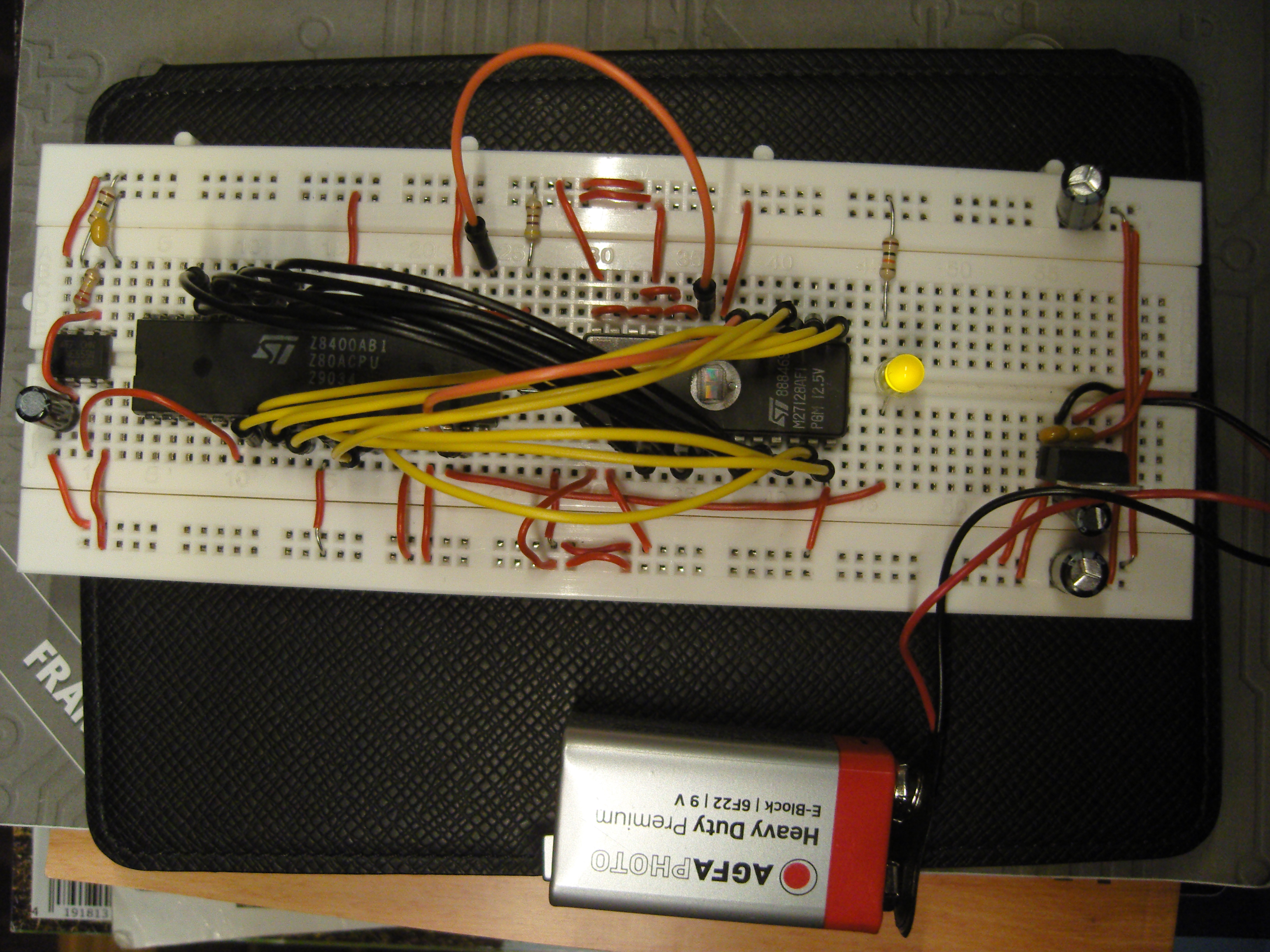 Jetzt habe ich auf meinem Steckbrett einen Z80A mit ~2Hz Clock vom NE555 am werkeln und ein M27128A-EEPROM mit 8-bits angeschlossen. Dazu noch nen Reset-Taster (unter den schwarzen Kabeln) und eine LED am HALT-Port, die an geht, wenn das HALT-Flag aktiv ist.