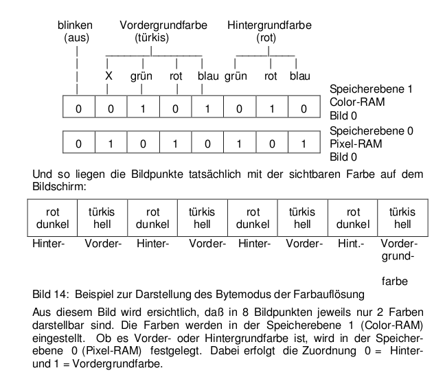 Dieses Byte legt also für 8 Bildpunkte eine Vorder- und eine Hintergrundfarbe fest.