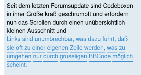Seit dem letzten Forumsupdate sind Codeboxen in ihrer Größe kraß geschrumpft und erfordern nun das Scrollen durch einen unübersichtlich kleinen Ausschnitt und Links sind unumbrechbar, was dazu führt, daß sie oft zu einer eigenen Zeile werden, was zu umgehen nur durch gruseligen BBCode möglich scheint.