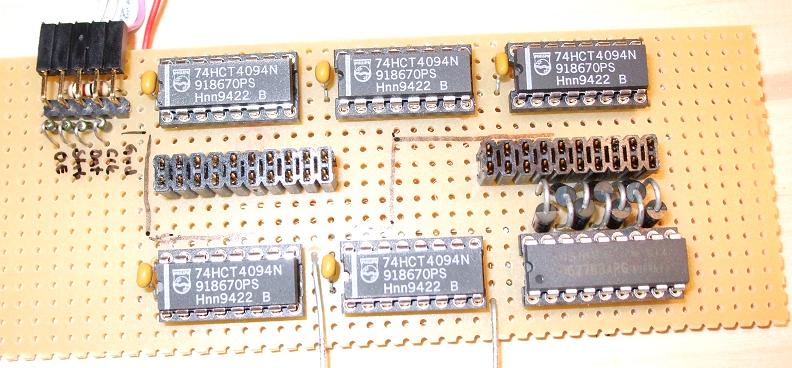 Zur Ansteuerung verwende ich fünf Schieberegister (HCT4094) in Serie. Diese liefern 8 Bits für die Zeilen und 32 Bits für die Spalten, wovon ich allerdings nur 7*30 benötige.