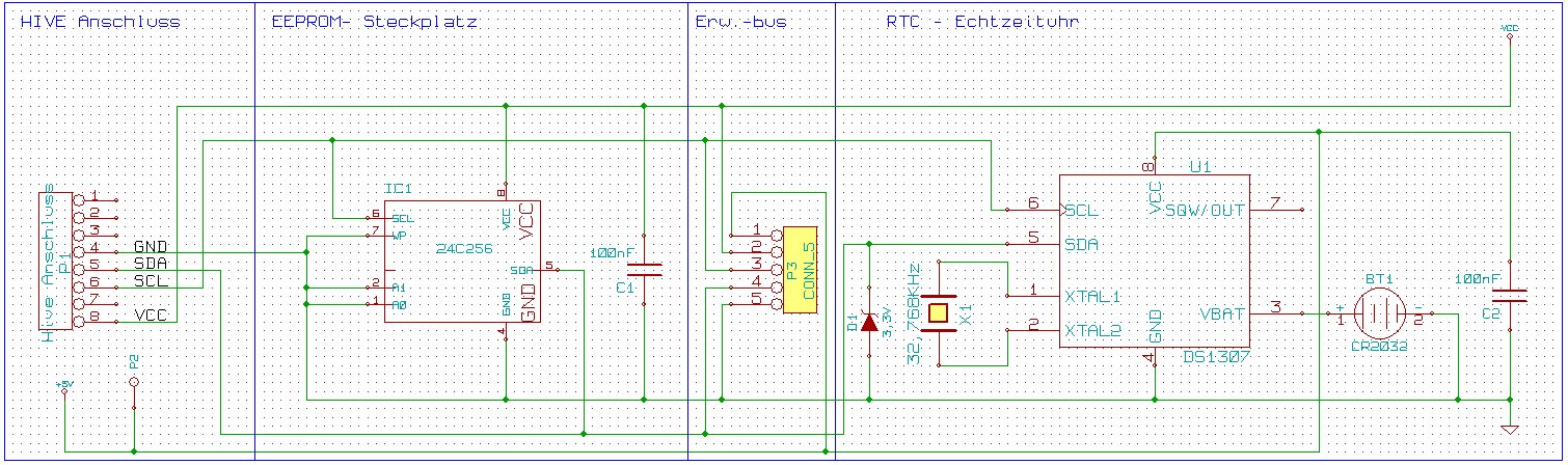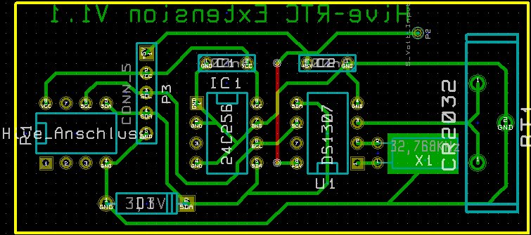Ich habe mal schnell eine neue Version erstellt und hier mit angehängt. Der DS1307 Chip läßt sich mit der kleinen Modifikation dann auch mit seinen ihm zustehenden 5 Volt versorgen. Die Zener Diode auf der Datenleitung sollte den Chip davon abhalten die Datenleitung über 3,3 Volt hinaus zu belasten. Evtl. ist die Diode nicht unbedingt nötig, habs noch nicht ausprobiert. Auch habe ich den Hive- Anschluss gedreht, so das sich die kleine Platine leicht über ein Flachbandkabel links neben dem Hive anbringen lassen sollte.