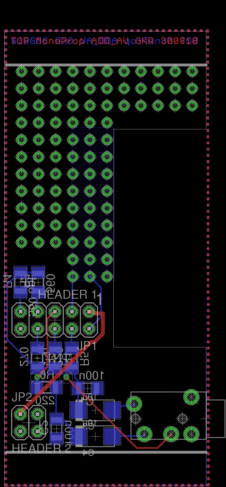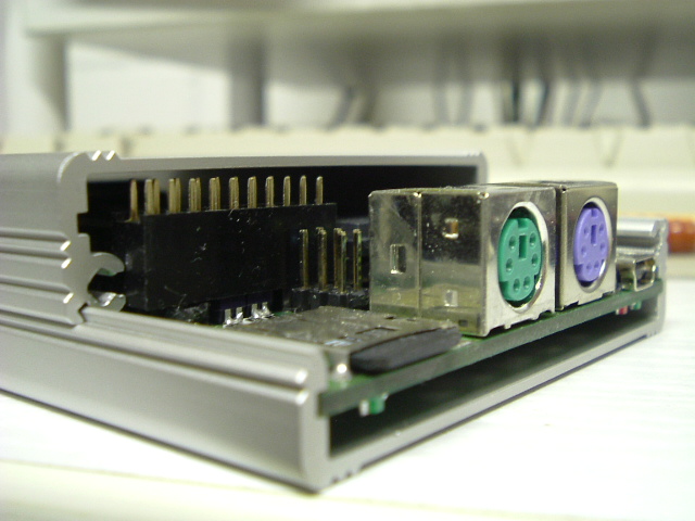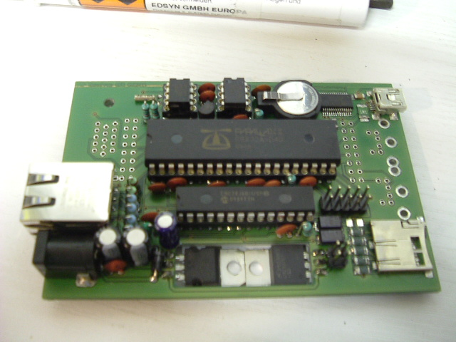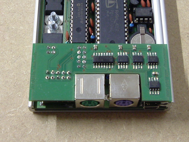 @BorgKönig : Die Bestückung mit SMD-Bauteilen an der USB-Schnittstelle und im Bereich der SD-Card liegt in der Schaffung von Freiraum u.a. für Audio- und Videoanschluß. Wie man auf dem Foto erkennen kann, ist bei einer Buchsenleiste von 8,5mm Höhe ca. 1mm Luft zwischen den Anschlußbeinchen und dem Gehäuseoberteil. und ca. 2,5 mm zwischen Platine und Gehäuseoberteil. Das ist nicht genug Platz für Buchsen. Also mußte ich Platz auf der Unterseite, der eigentlichen Bestückungsseite einer Huckepackplatine, haben. Darum die Wahl einer kompletten SMD-Bestückung in diesem Bereich.
