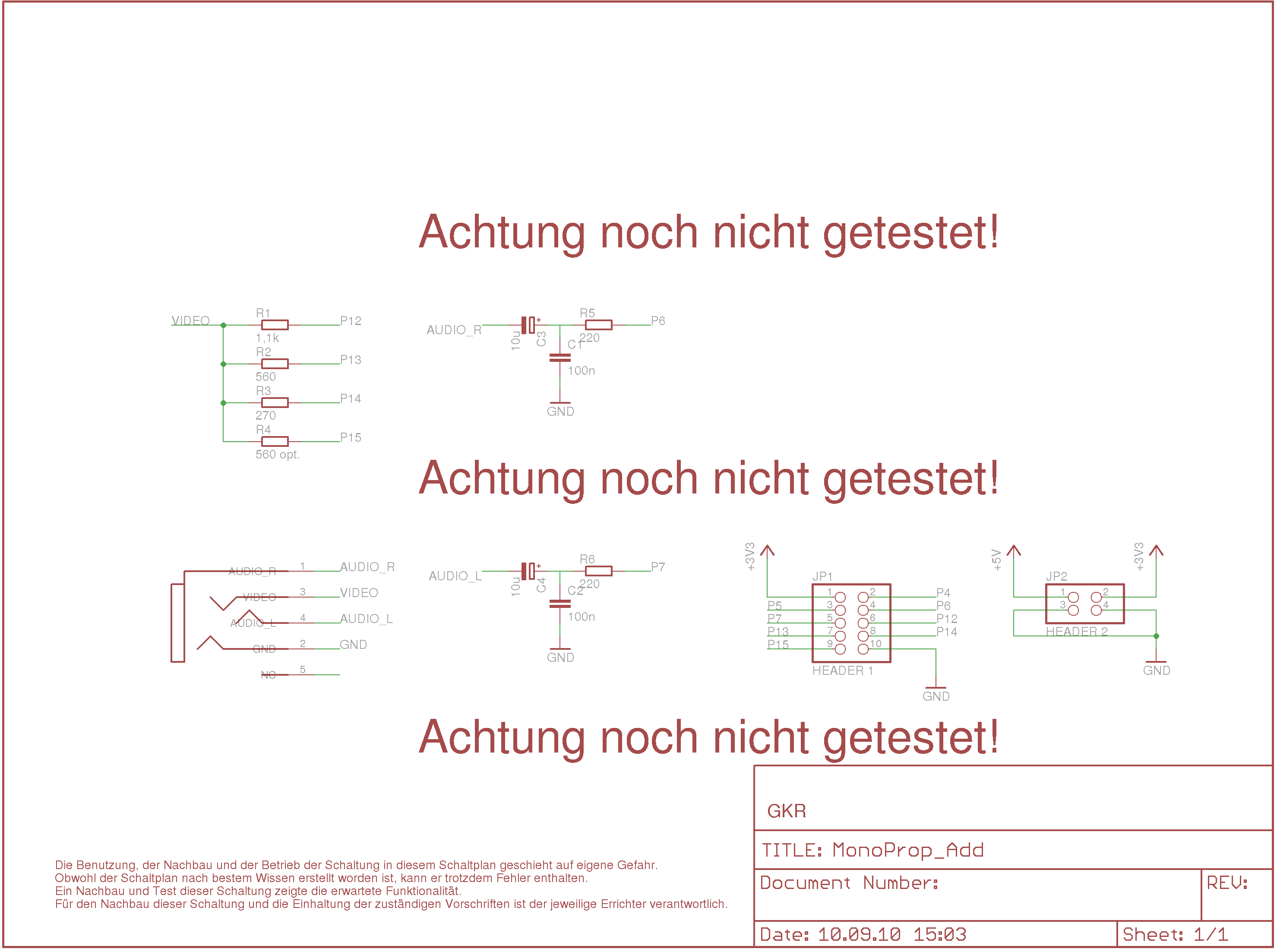 Ich habe neben anderen Platinen eine AV-Huckepackplatine für den MonoProp entworfen. Eine 4-polige 3,5mm Klinkenbuchse und ein Adapterkabel stellen die Verbindung zum Fernseher her. Das Adapterkabel ist ein handelsübliches Kabel (4-polig Klinke auf 3 x Cinch) wie sie für einige Camcorder üblich sind.