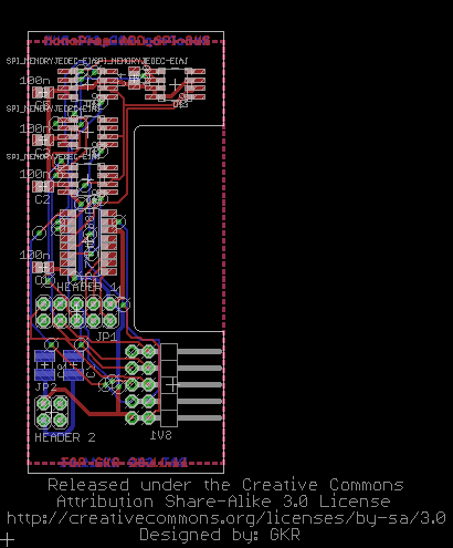 Dazu gehören 2 x SRam, 2 x Flash-Speicher, der Kanalencoder und Verbindungsstecker zu den Pinheadern auf dem MonoProp-Board und schließlich einen Stecker mit SPI-Anschluß mit 3 Kanälen für externe Anwendungen. Da es im MonoProp schon ziemlich eng ist müssen hier SMD-Bauteile eingesetzt werden.