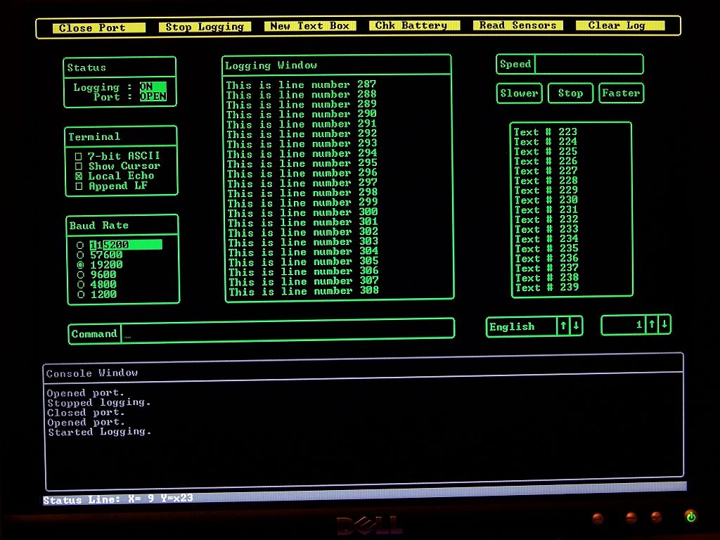Kopiert nach und runterladbar von http://forthfreak.net/textgui/ . Unbekannte Taste sollte eine Befehlsübersicht anzeigen. Ich vermeine, mich zu erinneren, daß die eine oder andere Demo nach kurzer Zeit von fehlendem Input anfängt, in eine Art Animationsmodus zu wechseln. Nicht ausgeschlossen, daß auch Kompilate, welche diese TextFenster im grafischen Modus (VGA/EGA) malen wollen, dabei sind.