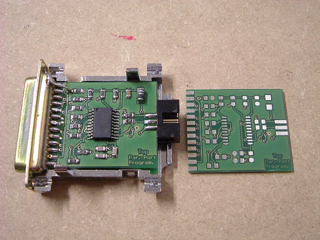 Parallelport-Programmierer für AVR's. Diesen benutze ich mit AVR-8-Burnomat zum Brennen des Bootladers und der Fuses. Im gegensatz zu meinem ISPtiny-Prommer funktioniert er wenigstens problemlos.