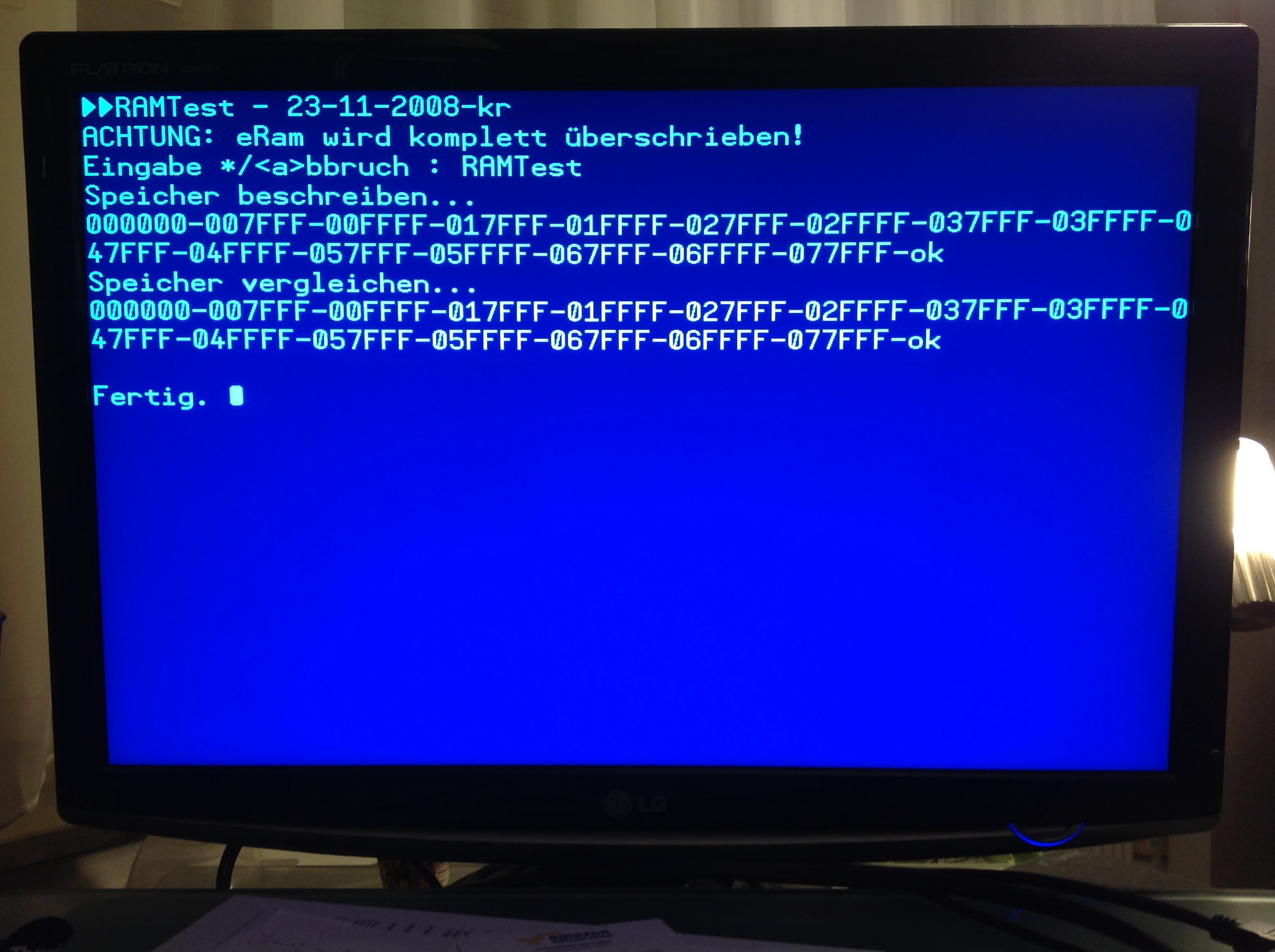 Der RamTest läuft sauber durch. Beim zweiten Test kam allerdings kein Eingabeprompt, sondern nur das Hive-Logo. Vermutlich weil noch Bauteile fehlen?