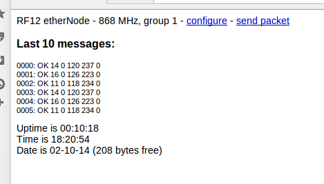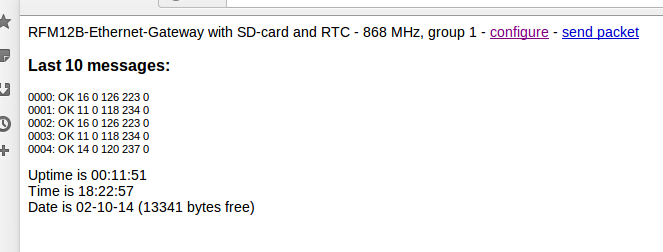 Beigefügt sind die Bildschirmfotos der Webseiten der beiden Gateways, AGW_2 und AGW_3. Die Software unterscheidet sich nur in der zusätzlichen Einbindung der SD-Karte beim AGW_3. Die Darstellung der Webseiten beruhen auf Beispielsoftware von JeeLabs und zeigen noch nicht den angestrebten Zustand. Dargestellt sind die eingehenden Pakete drahtloser Sensoren, die Laufzeit (uptime) des Servers seit letztem Reset, die Uhrzeit und das Datum aus der RTC sowie der noch freie Speicher. Die Server werden mit ihrer echten MAC-Adresse und DHCP im Hausnetz angemeldet die Uhrzeit wird von einem NTP-Server geholt und die interne RTC wird damit gestellt. Der noch freie Speicher, sowohl Flash als auch RAM, im ATmega1284P lädt zu üppiger Webseiten Gestaltung ein.