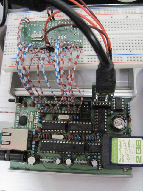 Nachdem die Kamera jetzt mit neuen Batterien bestückt ist gibt es jetzt noch ein Foto vom Versuchsaufbau mit ATmega1284p-Modul auf dem Breadboard.