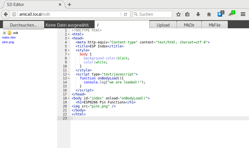 Na dann mal schau'n ob die Karte erkannt wurde... also Firefox auf die URL werfen und derweil die Serielle des ESPchens beäugen...