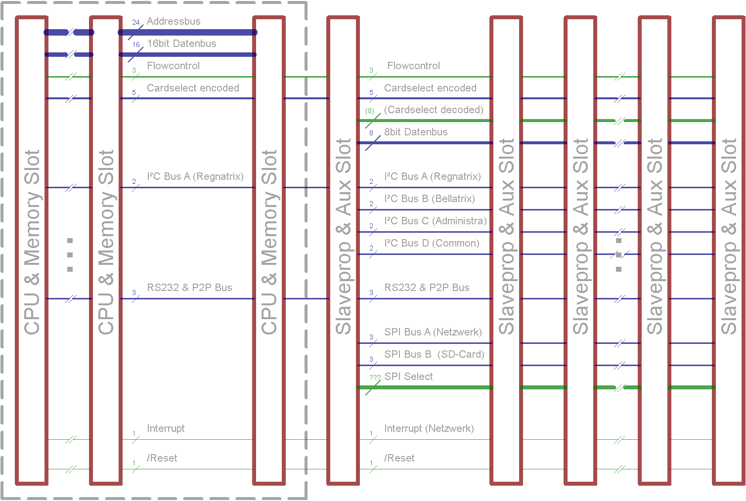 Technisch sind mit den 5 Steuerleitungen bis zu 16 Busteilnehmer auf den Parallelbussen (16bit-RAM-Bus & 8bit-IO-Bus) möglich.