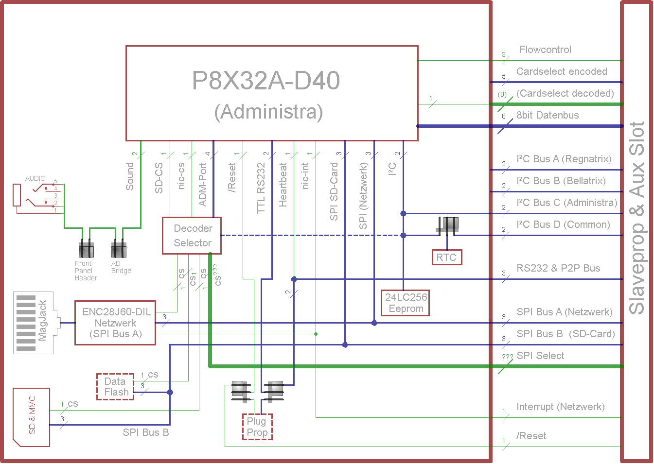 Es geht sogar soweit, das die Slaveprops am 8bit-IO-Bus (nach Freigabe durch Regnatrix) eigenständig auf den Speicher zugreifen können. Sozusagen ein DMA-Zugriff.