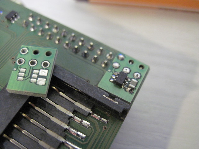 Links im Bild liegt die unbestückte Adapterplatine auf der SD-Kartenfassung und rechts im Bild ist er bestückt und aufgelötet.