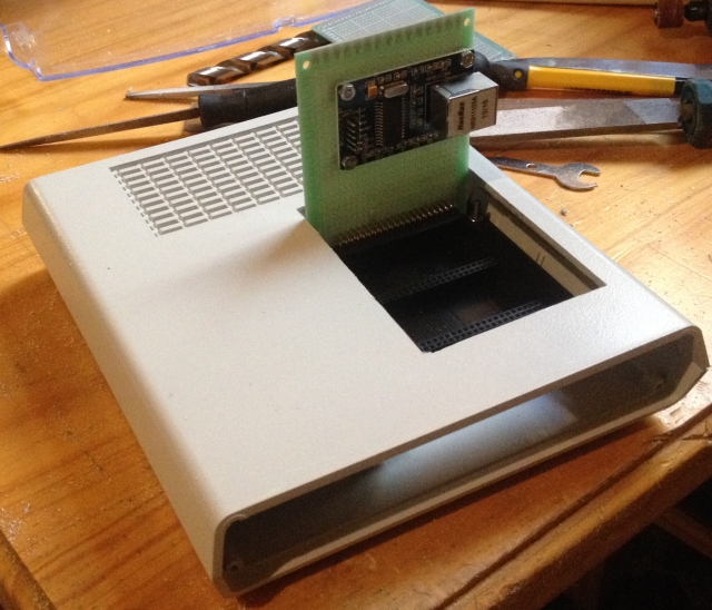 Ich hatte den Netzwerkteil nicht bestückt, als ich begann, das Board zu verbauen. Jetzt ist alles im Gehäuse und ich hab keine Ambitionen, alles nochmal auseinander zu reissen. Macht ja auch nichts, hab bei eBay ein kleines Netzwerkmodul, was den gleichen Controller hat, erstanden und werde es als erstes Steckmodul am Hive testen. Die Software braucht nur kleine Änderungen, wenn die Netzwerkfunktion in Venatrix laufen soll. Dafür bleibt in Administra noch Platz für andere Sachen (z.Bsp. mein DCF77-Empfänger).