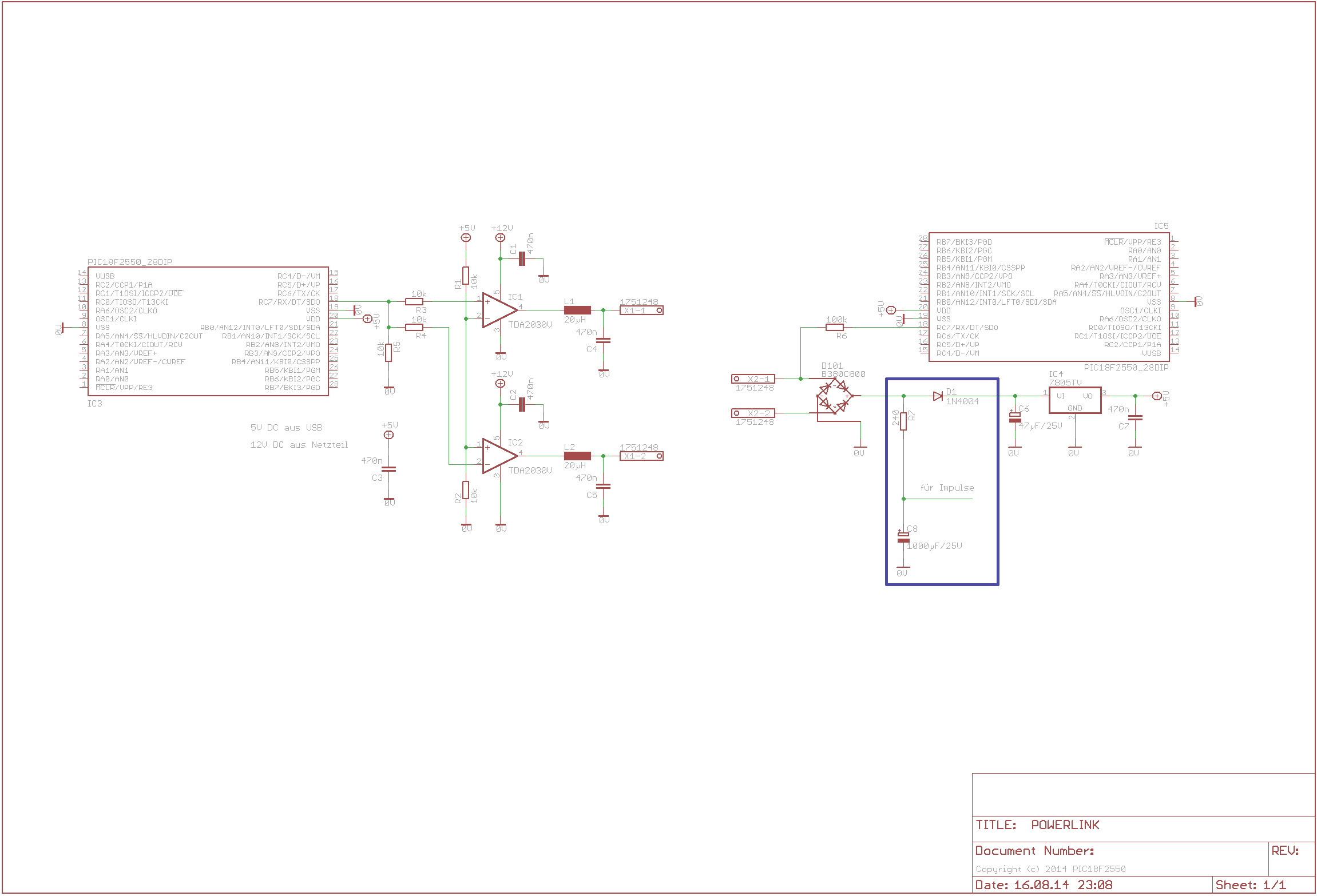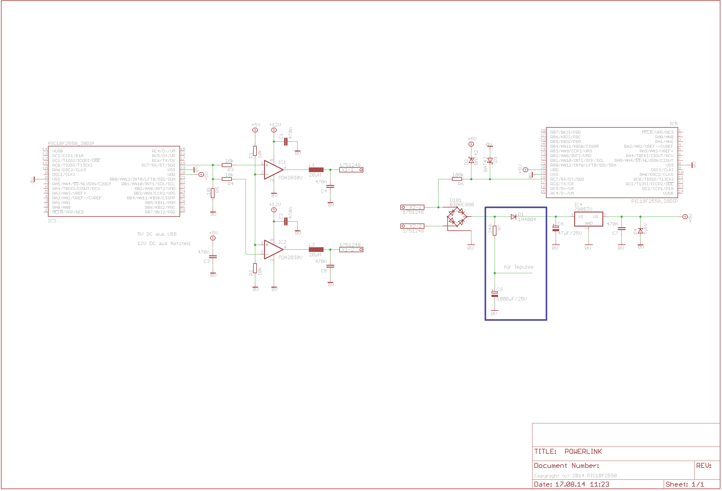 EDIT2: der Signalabgriff erfolgt direkt vom Bus, wenn ich es richtig verstehe ist bei 12V Busspannung der Signalabstand vom in der Grätzschaltung gebildeten GND dann entsprechend entweder +12V oder -12V. Zwei Fragen dazu: Gehört die Diode D1 eventuell in jene Leitung rein? Und ist diese Spannung nicht ggf. etwas viel für den Signaleingang des Microcontrollers? Müsste da statt des 100K Widerstands R6 nicht besser ein Spannungsteiler von 12V auf 5V hin?