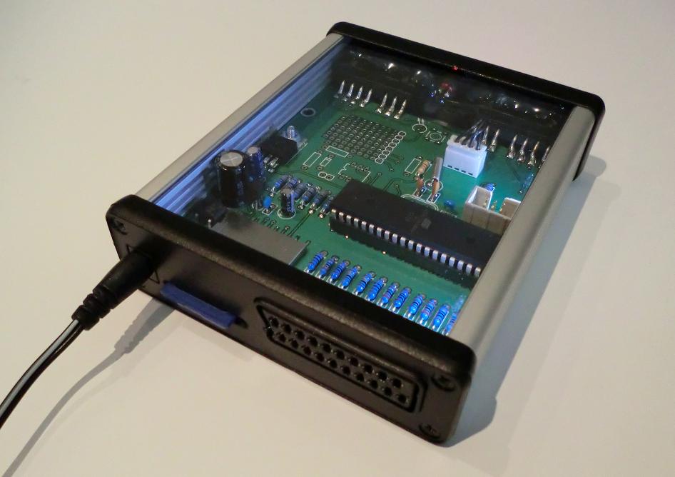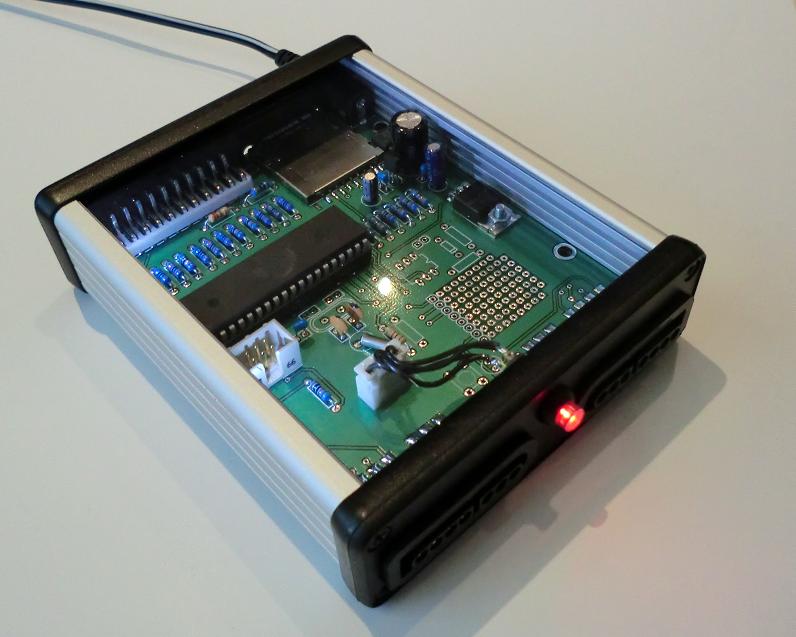 Hier noch ein paar Fotos von meiner "Showbox" für die Lange Nacht der Computerspiele ... Mit etwas Geschick kann man auch das "L" Gehäuse nehmen, wie man sieht. Ich hab das gehäuse umgedreht und statt der Alubodenplatte eine Plexiglasplatte eingesetzt, damit man das Innere sehen kann. Zusätzlich ist noch eine Beleuchtungsplatine mit 2 weißen LED und Konstantstromquelle eingebaut... Die Leiterplatte ist übrigends ein Prototyp der neuen Version 01-05, die es in einigen Wochen serienmäßig gibt. Das Synch-patch ist hier schon integriert und es gibt einen Breadboard-Bereich, wo man eigene HW Erweiterungen aufbauen kann... Außerdem ist ein Erweiterungsstecker drauf, der die Betriebsspannungen, UART und ein paar weitere Ports für Erweiterungen zur Verfügung stellt.