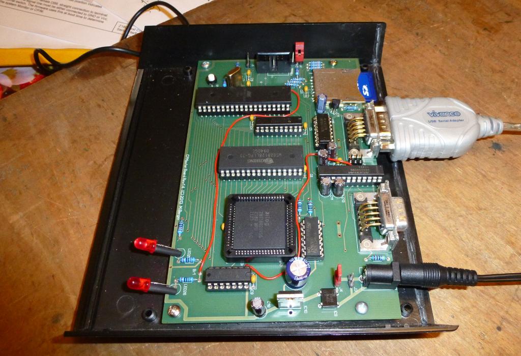 J2 - ein Jumper zwischen dem mittleren Pin sowie dem Pin in Richtung SD-Karte, wenn CP/M direkt starten soll (Foto), alternativ zwischen mittlerem Pin und dem Pin in Richtung ISP Stecker, wenn nach Stromanschluss der Monitor gestartet werden soll