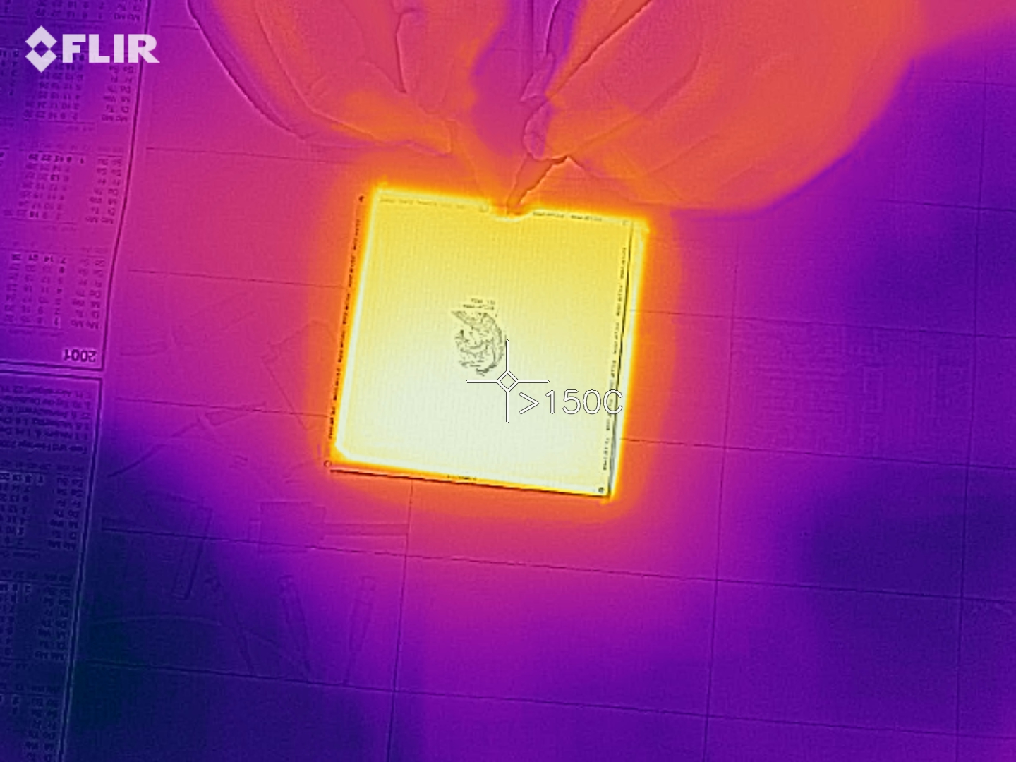 Wir sind jetzt also bei ganz grob 100W Leistungsabgabe über eine Seite. Die Rückseite strahlt maximal das gleiche ab, eher weniger, da die Keramik hier hoffentlich etwas isoliert. Wenn das ganze einigermaßen schnell aufheizen soll (Wärmekapazität der Platte), würde ich etwa 200W-300W Leistung einplanen.