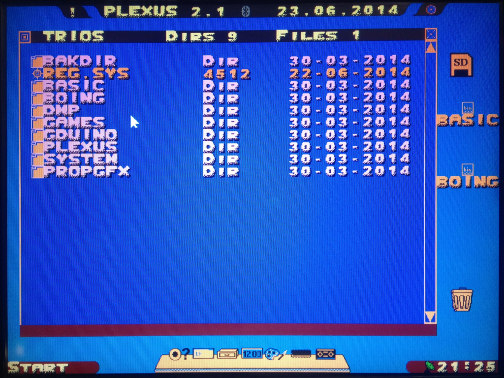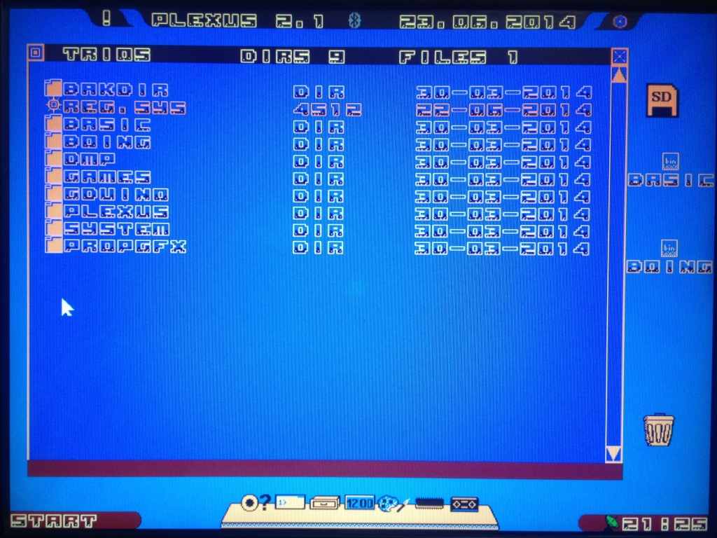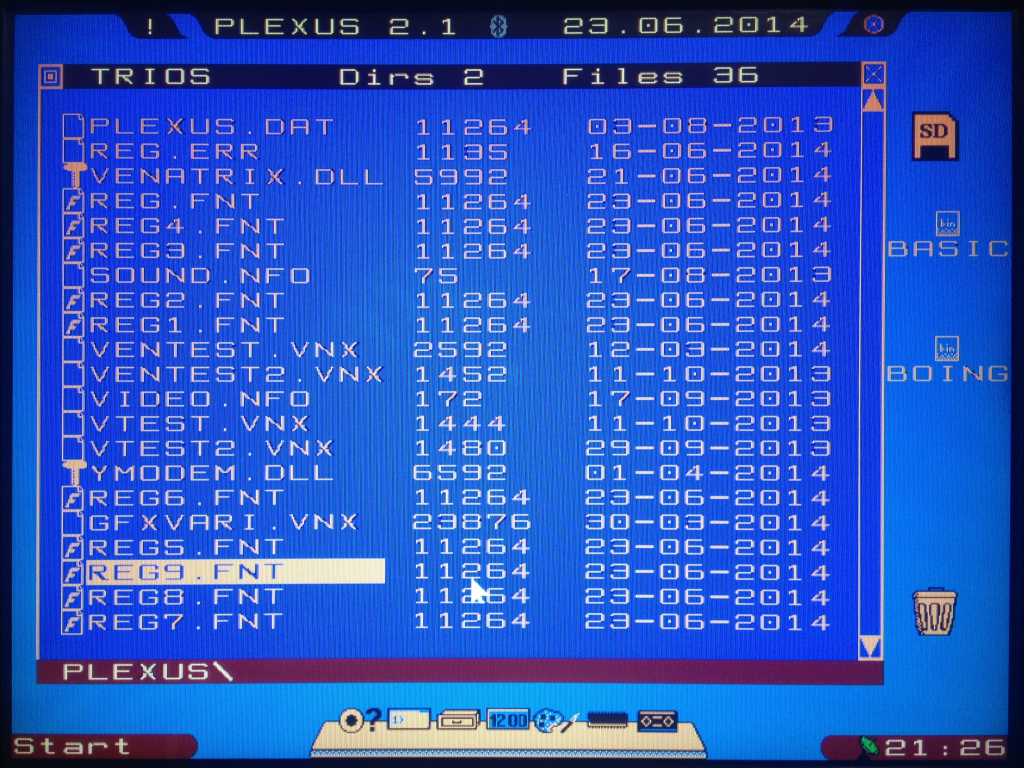 Nachdem Plexus nun schon einige Versionsaufstiege hinter sich gebracht hat, fand ich es an der Zeit, die, aus meiner Sicht, etwas langweilige Optik endlich aufzuhübschen. Herausgekommen ist eine aufgelockerte Oberfläche, die nicht nur Geradlinigkeit kennt. So wurde zum Beispiel die obere Titelzeile gekürzt und zeigt nach Bedarf zusätzliche Informationen an. Mit einem Klick auf das Ausrufezeichen klappt die Titelzeile nach rechts und links auf und erlaubt die Darstellung der Mauskoordinaten bzw. den letzten gedrückten Tastencode. Ebenfalls nur bei Bedarf sichtbar ist die Statusleiste am unteren Bildschirmrand. Diese klappt ebenfalls bei Erscheinen der erweiterten Titelzeile auf und stellt den Dateinamen der letzten benutzten Datei an. Das Explorerfenster hat nun eine eigene Statuszeile, In der jetzt der komplette Verzeichnispfad angezeigt wird (war bisher nicht korrekt gelöst). Weiterhin ist es jetzt möglich, andere Fontdateien unter Plexus zu benutzen, was dem Aussehen einen ordentlichen Schub verleiht. Zu diesem Zweck werden verschiedene Fontdateien mitgeliefert, die per Doppelklick im Explorerfenster aktiviert werden können. Insgesamt wirkt Plexus nun moderner und bleibt trotzdem Retro