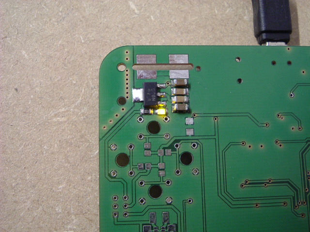 7. Anschluß der 5V-Spannung über USB-Kabel. Die LED sollte leuchten und am Ausgang des Reglers sollten 3,3V gemessen werden.