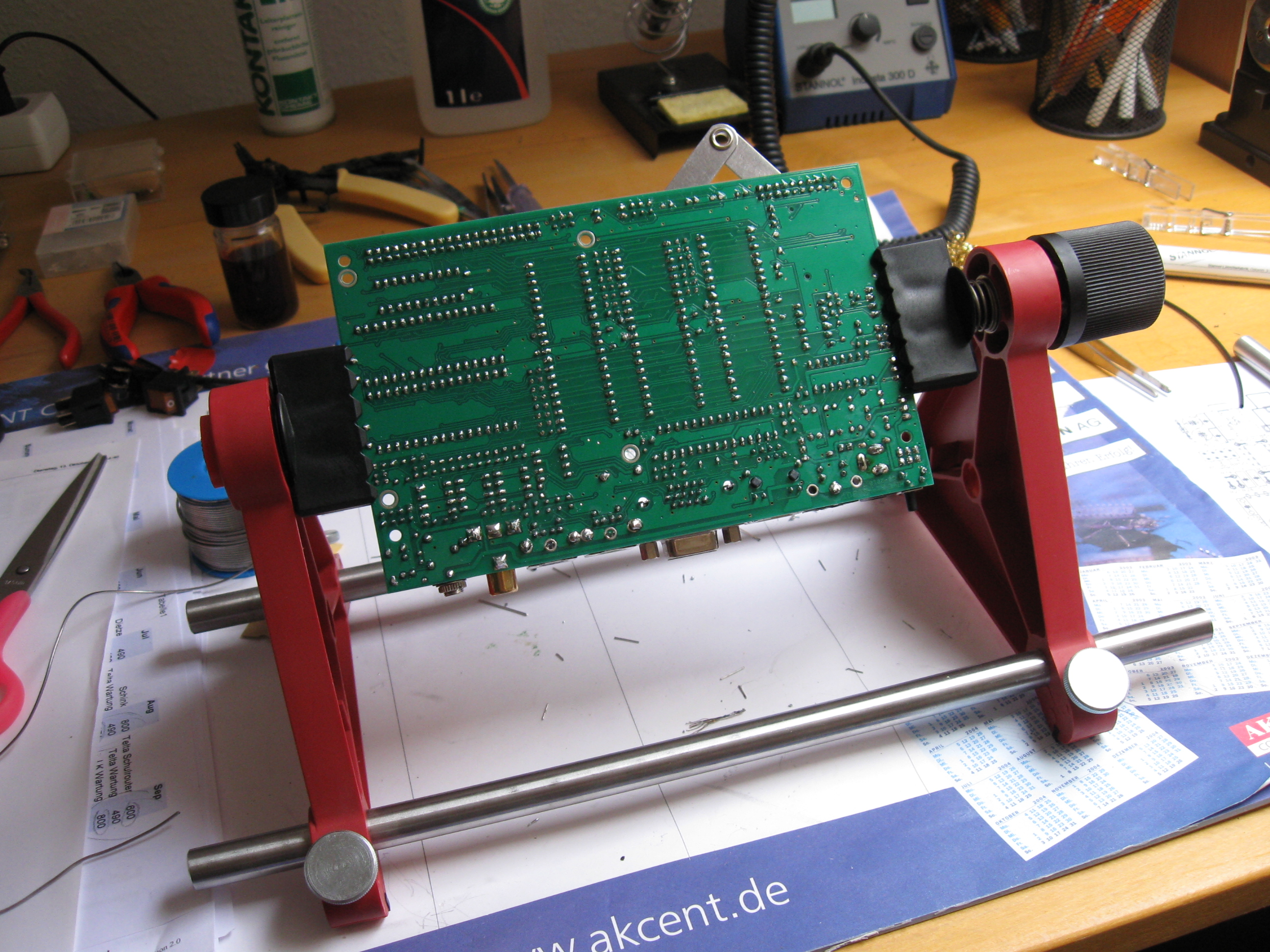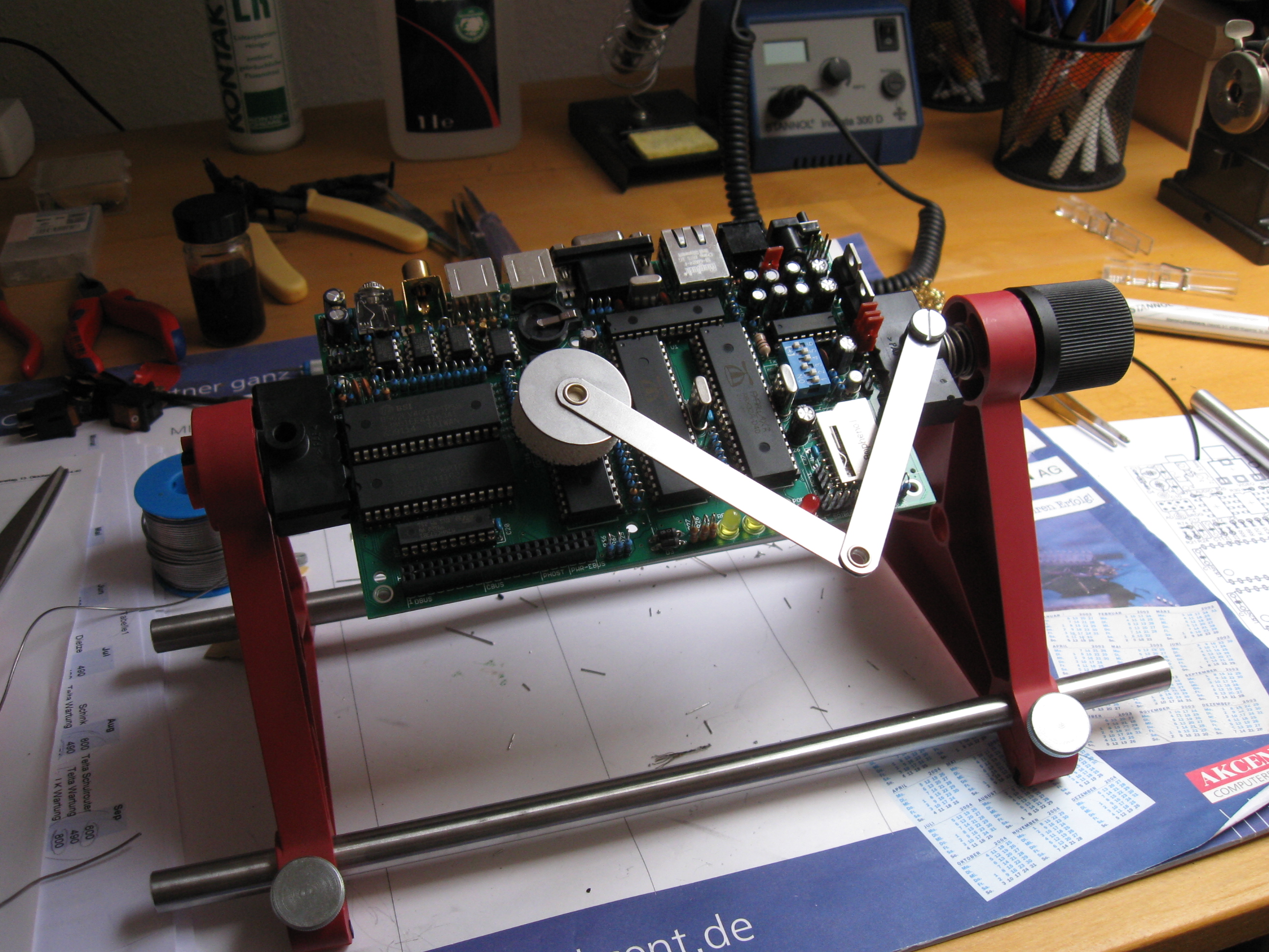 Platine einklemmen .. Bauteile einstecken ... Haltearm auf das lose Bauteil drücken ... Platine im Gestell drehen ... löten .. ferti.
