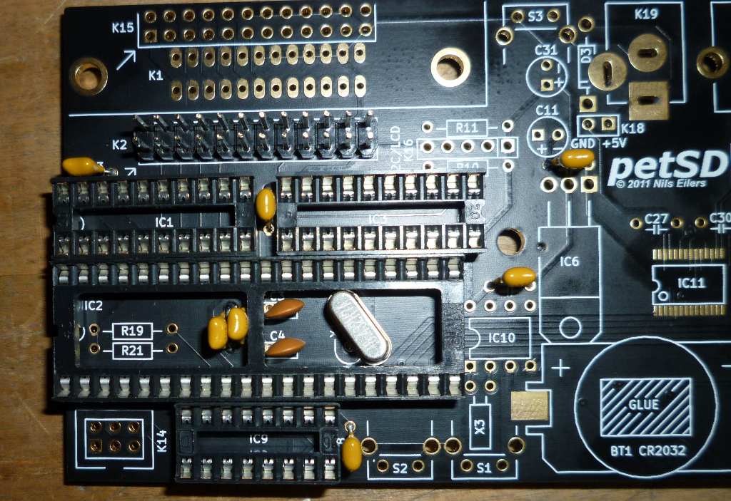 Toll dass es den PetSD Bausatz gibt - für PETs gibt es sonst wirklich nur sehr wenig, da diese Computer nie große Verbreitung hatten. Aha-Effekt beim Basteln dieses Teils: wie extrem man Platz sparen kann beim PCB-Design. Auf diesem Board sind teilweise die Bauelemente innerhalb der Chip-Sockel untergebracht, die Chips sind sehr dicht gepackt.