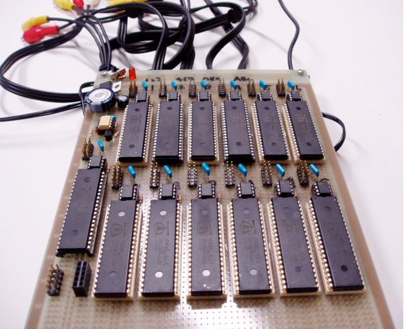 Hmm, schwer zu sagen. Theoretisch ist es wohl möglich mehrere Propeller aus einem externen Oszillator zu speisen, aber ich sehe überhaupt keinen Quarz auf der Platine. Der gelbe oben links ist wahrscheinlich ein Optokoppler für das Midi-Interface (hab ein wenig auf der Original-Webseite geschnorrt, das Board gehört zu einem interaktiven Kunstprojekt mit einer Bildschirmwand). Ich kann mir aber auch nicht vorstellen das er die Propeller ohne Quarz freischwingen lässt - was ja auch geht.