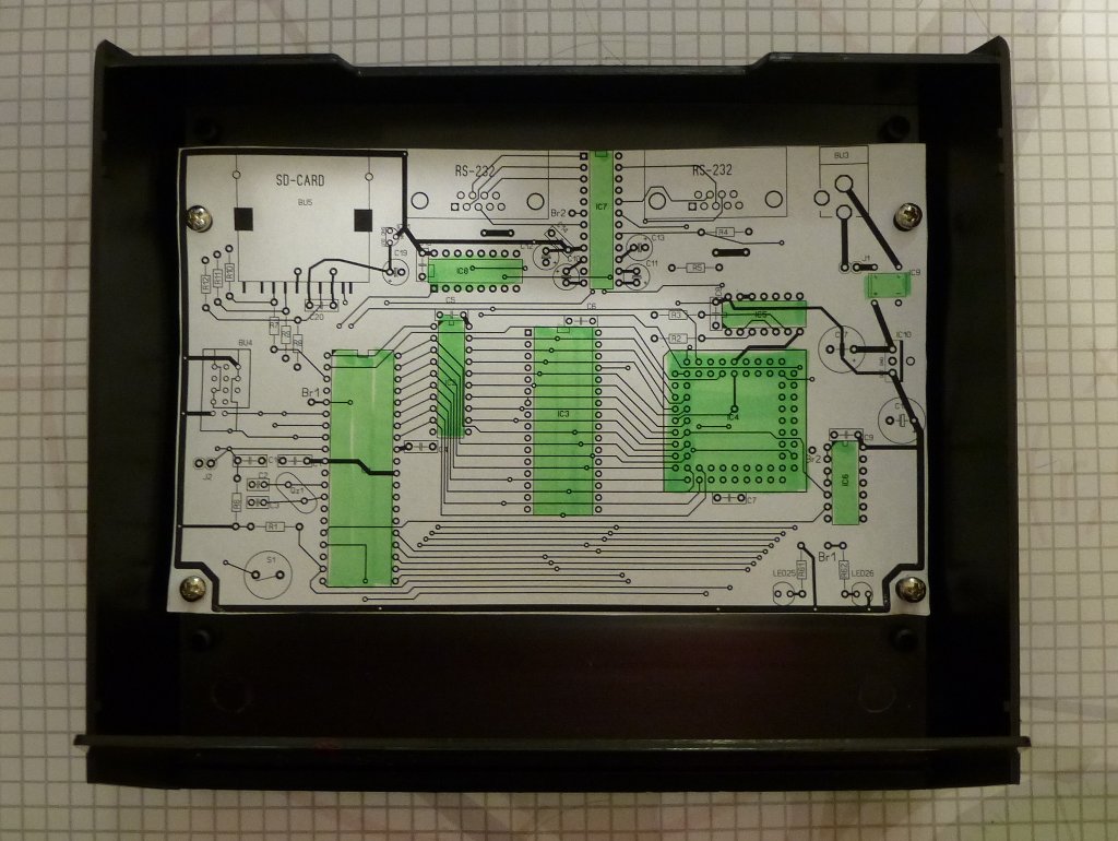 Ausserdem konnte ich es mir nicht verkneifen, mal eine "Anprobe" mit einem 1:1 Ausdruck der Leiterplatte zu machen, auf die ich gerade sehnsüchtig warte (die kommt vermutlich erst Ende nächster Woche, seufz...)