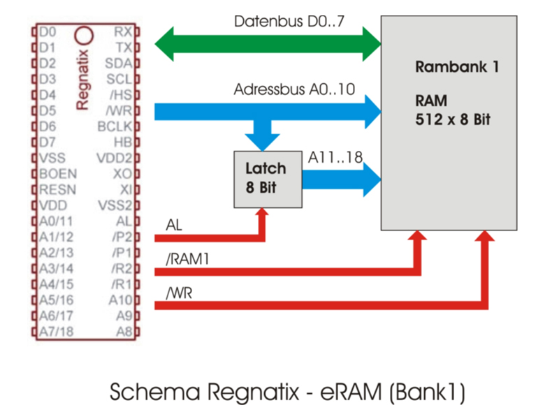 Das RAM-Interface beutzt drei eigene Steuersignale. Das Signal /WR bestimmt die Schreibrichtung: Ist dieses Signal High, wird ein Byte gelesen, ist es Low wird ein Byte geschrieben. Wie schon bei der Kommunikation der Propellerchips müssen wir an diesem Punkt den Modus der Datenbusleitungen an Regnatix beachten, damit es zu keinem Buskonflikt kommt. Das Signal /RAM1 & 2 wählt mit einem Low selektiert entsprechende Rambank. Mit dem Signal AL steuern wir unser Adresslatch. Dieses Adressregister benötigen wir im Hive, da wir nicht genug I/O-Ports an Regnatix haben, um eine vollständige 19Bit-Adresse direkt auszugeben. Also speichern wir den höherwertigen Teil (HWT) A11-18 der Adresse in einem Latch. Dafür sind die Eingänge des Registers an die Adressports A0..7 angeschlossen. Legen wir dort den HWT an, so wird dieser mit einem Impuls am Signal AL im Latch gespeichert. Drauf folgend können wir an den Adressports von Regnatix den niederwertige Adressteil (NWT) anlegen und den Speicherbaustein selektieren um ein Byte zu lesen oder zu schreiben.