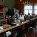 Zu den Räumlichkeiten: Pausin (dort fand die letzten Jahre das Treffen statt) war ziemlich kuschlig und eng. Insofern war es nach meiner Meinung ein richtiger Schritt, sich nach einem Veranstaltungsort mit mehr Potential umzusehen. Was Platz, Unterbringung und Versorgung betraf, war Garitz ideal. Ok, in einem aufgebetteten Vierbettzimmer zu schlafen war schon wieder fast Ferienlagerromantik, aber viel Zeit für Schlaf war eh nicht zu finden. Im großen Saal konnte ich mich selbst mit meinen kleinen Hives so richtig breit machen, aber vor allem die teilweise sehr gewichtige DDR-Technik mußte sich nicht drängen. So war es möglich, die Geräte auch ein wenig geordnet aufzustellen – mit viel Potential für die nächsten Jahre. Zum Beispiel könnten die Vorträge ja durchaus auch auf der Bühne mit besseren Lichtverhältnissen für den Beamer und Tonanlage stattfinden.