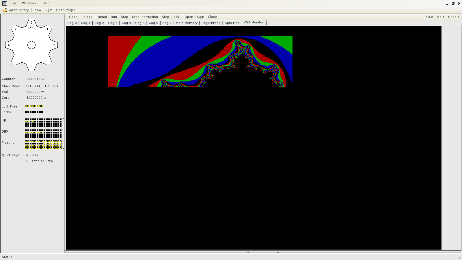 Dabei zeigte sich sogar noch ein Bug in der optimierten Umwandlung von langen Listen von Konstanten für den DAT-Block in der PASM-Ausgabe des Kompilers, der natürlich nicht bei uninitialisierten Arrays auffiel. So schaute ich zunächst 'ne Weile (***Hust!!!*** Taaageeelaaang!) abwechselnd verdutzt und frustriert darauf, daß ich zwar Mandelbrötchen auf VGA-Bitleinwand malen konnte, aber ein konstantes Bild anzeigen mit einer verzerrten Ausgabe scheiterte. Ich hab da wieder mal viel zu lange den Fehler in meinem Code gesucht bis ich endlich den Compiler anfing schief anzusehen und dann sogar die Stelle an der es knallte in seinem Quelltext fand.