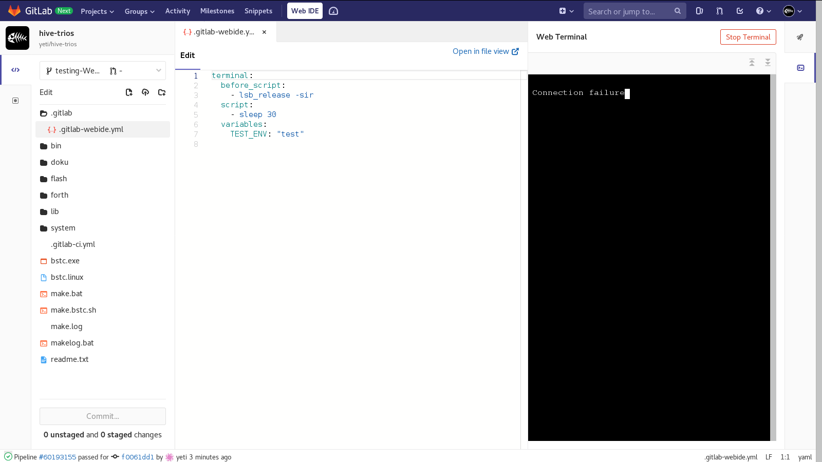 Ich spiel mal wieder mit GitLab und dessen WebIDE herum, aber es ist offensichtlich nicht nur von Erfolg gekrönt:
