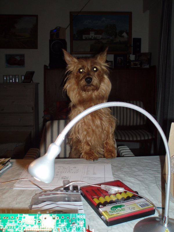 Die kleine Hündin schaut noch nicht so richtig begeistert, dabei müsste sie das kennen denk ich - der Lötkolben sieht so aus als ob das nicht die erste Bastelei ist.