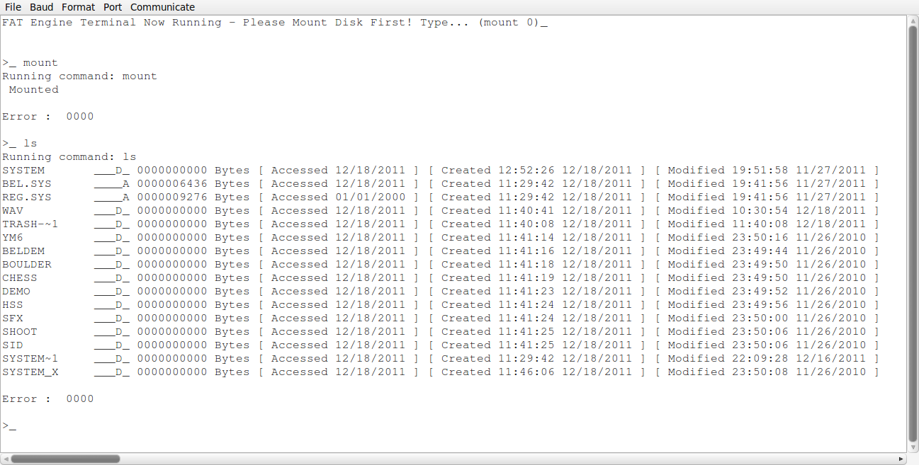Hier ist mal ein "Administra-Terminal". Wenn man das in Adm lädt, läuft auf dem Chip eine Kommandozeile. Du mußt ein Terminalprogramm starten (oder das Parallax Serial Terminal), 57 KBaud einstellen und kannst dann mit mount/unmount/ls usw. direkt auf dem Chip arbeiten. Im Normalfall mounted das Terminal sofort die Karte, aber man kann halt auch manuell experimentieren und schauen was passiert. Doku liegt bei.