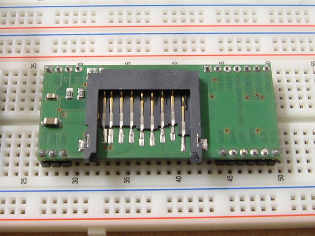 Abstand der 20-pol Kontaktleisten ist 900mil (0,9"). Somit bleiben links und rechts vom Modul jeweils noch eine Buchsenreihe im Breadboard frei für Drahtanschlüsse.