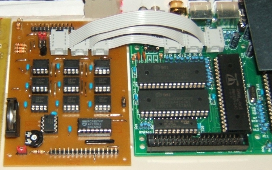 Für mich kahm diese Anfrage leider auch eh viel zu späht, da ich die Platinen schon vor einem Monat Designed und Geätzt habe. Mitlerweile sind sie bereits fertig bestückt und verbaut. Und wegschmeissen und neu machen, nur wegen einer Uhr, werd ich wohl nicht machen. Auf dem beigefügten Bild sieht man die Platine mit den EERPOM's, der Uhr und dem LCD- Interface. Auch die Verkabelung mit den original Sockeln auf dem Hive ist zu sehen. Das Bild ist nicht ganz aktuell, da mitleriweile auch der Cartridge-Port aufgelötet ist und die Blenden für das Gehäuse auch schon passend gefertigt sind.