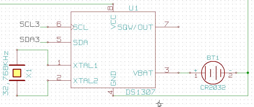 Hm, der Chip an sich ist nicht Pinkompatibel mit den EEPROM's. Um eine einfache Lochrasterplatine wird man dabei nicht wohl nicht umzu kommen. Du must ausser dem Chip auch noch eine Batterie für das Backup und einen kleinen Uhrenquarz mit unterbringen. Wenn man ganz dolle geschickt ist, kann man das auch fliegend direkt auf eines der EERPOM's oben drauf löten. Besser ist jedoch eine kleine Platine. Das folgende Bild zeigt das Schema des Chips mit seinen Pins und was dort angeschlossen werden muss. Rechts die 3.3 Volt Lithium- Baterie (CR2032) wie ich sie verwende. Rechts der 32,768 KHz Quarz. SCL und SDA müssen an die enstrehenden Leitungen des jeweiligen EEPROMS angeschlossen werden. VCC an die 3,3 Volt des I2C- Busses und GND an die Masse. Alles in allem noch recht einfach aufgebaut. Aber vorsicht ! Der Chip ist sehr Empfindlich was störungen angeht. Der Quarz muss möglichst dicht am Chip sitzen und sollte eine eigene kleine Massefläche drunter haben, sonst läuft die Uhr ggf. nicht genau genug. Die Spannungsversorgung kann man auch einfach an den EERPOM's abgreifen.