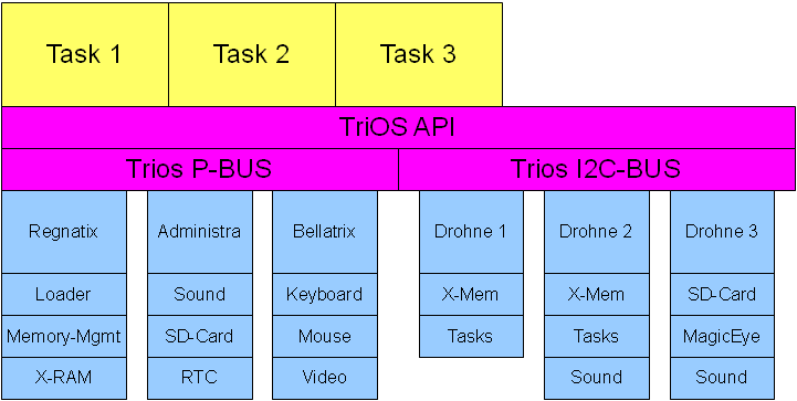 drohne235 hat geschrieben:Irgendwann nach dem KC-Treffen möchte ich beginnen das bestehende Betriebssystem neu zu überarbeiten und eine erste Version des TriOS zusammenzustellen. Im folgenden meine groben Vorstellungen. Wie weit ich dabei komme und was letztlich dabei herauskommt muß ich mal schauen. Ich wollte mal die grobe Struktur zur Diskussion stellen, velleicht gibt es ja noch interessante Ideen dazu. Wer Lust hat kann natürlich mitarbeiten, dann geht das Ganze schneller. Und frühzeitige Mitarbeit sichert auch die Möglichkeit der Einflußnahme, denn spätere Programme werden wohl auf dieser Version aufbauen.