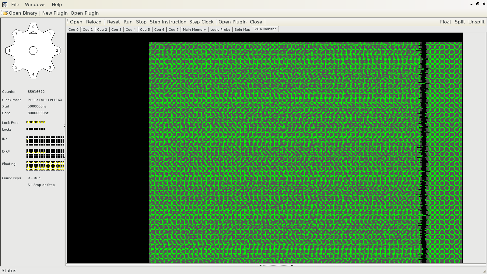 Das im OpenSpin-Thread erwähnte Hybrid-FastSpin/OpenSpin-Testprogramm, dessen im ersten Anlauf nicht Funktionieren zur Ersatzspielerei mit den reinen OpenSpin-Truchet-Tiles führte ist nun doch am Rennen und ich weiß sogar, was damals fehlte: Das __cognew ***hust!***, echt peinlich!
