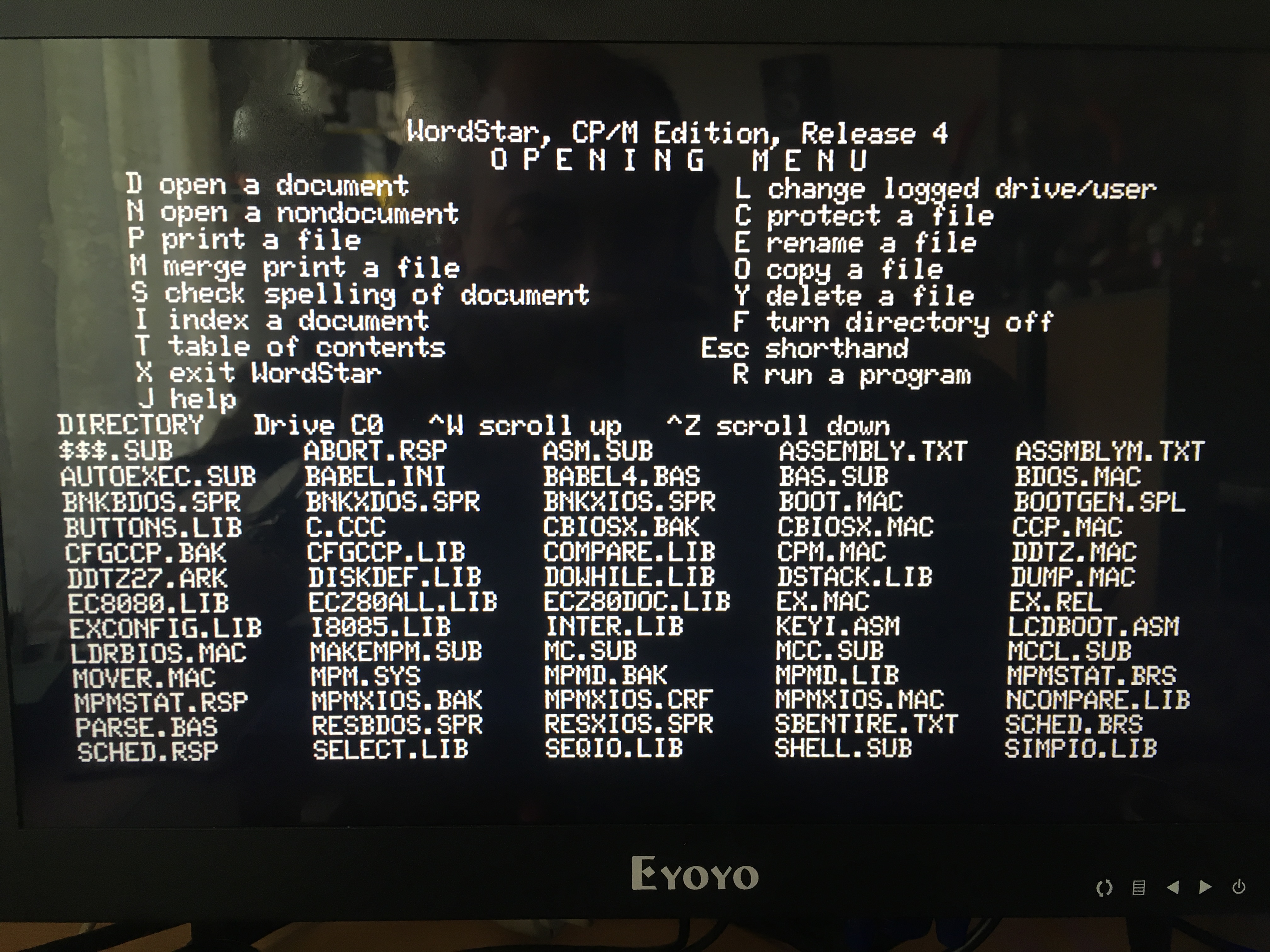 Nachdem die Hive-Max-Platine eine weitere Revision erfahren hat, welche leider nicht hundertprozentig so funktionierte, wie gedacht, gibt es aber auch etwas positives zu berichten. Vorweg, eine entscheidende Änderung betraf den VGA-Port von Bellatrix, hier wurden 2x4-Bit Buspuffer zwischengeschaltet, die es ermöglichen je 4 Pins des VGA-Ports für andere Dinge zu missbrauchen. So ist es nun möglich die im Übertümpelseitigen Forum gehuldigte CP/M-Emulation zum Laufen zu bringen. Die Ausgabe erfolgt zwar nur im TV-Modus aber für eine Schwarz-Weiss-Ausgabe mehr als ausreichend. Bisher ist es mir noch nicht gelungen, den Zweck der diversen, auf den Disk-Images gepackten Programme zu ergründen (dazu hab ich von CP/M zuwenig Ahnung) aber Wordstar, MS-Basic, C-Compiler usw. funktionieren schonmal. Nun muss ich mich mit der Materie etwas auseinandersetzen aber wir können sagen:"DER HIVE KANN CP/M".
