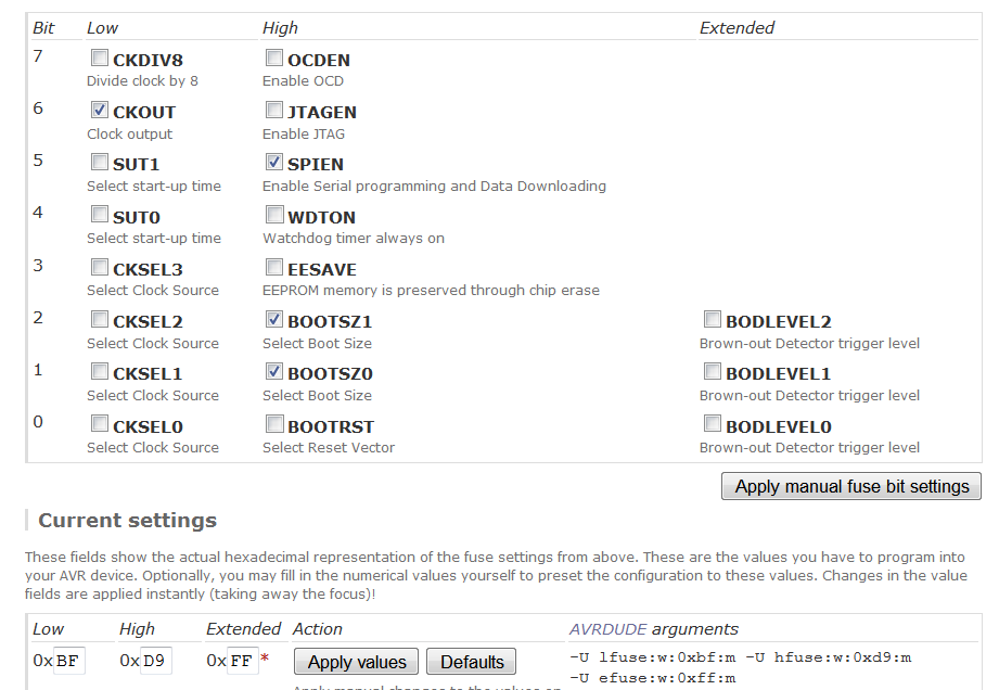 Als Anlage passende Fuses Einstellungen wie ich sie mit dem online calculator http://www.engbedded.com/fusecalc ermittelt habe. Wichtig sind die gesetzten Flags für CKOUT und SPIEN, die Bootsize Flags sind eigentlich egal, ser. Bootloader hab ich (noch) nicht reingebastelt in die Firmware.