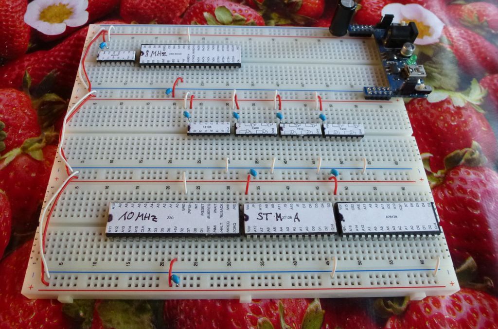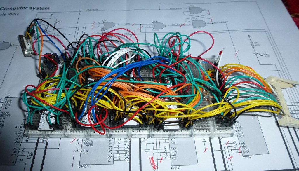 Die Crux bei diesem Computer ist auch, dass man den Aufbau kaum phasenweise testen kann. Ich werd wohl am WE noch mal alles auseinanderpflücken, und auf etwas hochwertigeren Steckbrettern, diesmal mit Seitenleisten für +- neu bedrahten. Ein paar Extras wie die Reset-Taster werde ich zunächst weglassen, CF-Card muss auch nicht gleich dran, da der Computer ein Monitorprorgam und ein Basic im ROM hat.
