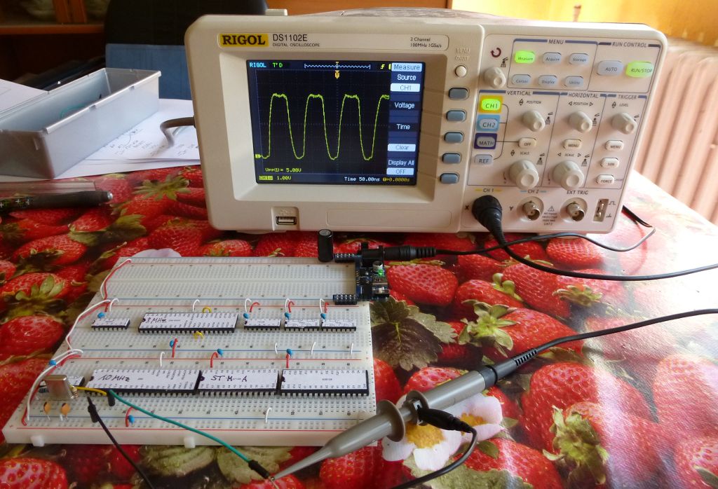 Allerdings sieht das Taktsignal doch deutlich anders aus als ein ideales Rechteck, zappelt auch ganz schön. Ich kann nur hoffen dass es trotzdem gut genug für den Zweck ist.