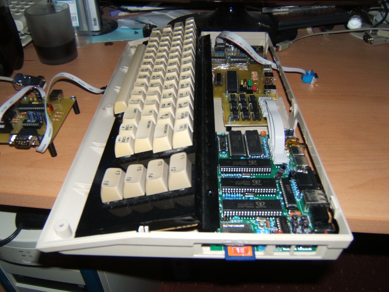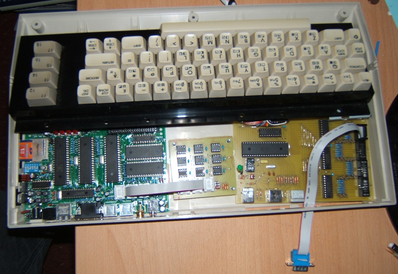 Wir haben den Prototyp des C64- Keyboard und Joystickadapter nun vollständig bestückt. Auch der Prototyp der EEPROM- Karte wurde nun endlich voll bestückt und getestet. Auf den Bildern kann man sehen, wie die EEPROM- Karte über 3 kurze Flachbandkabel mit der EEPROM- Platine verbunden wurde. Das Booten des original Hive Betriebssystems hat auf anhieb geklappt. Anzumerken ist, das die 3 EEPROM- Sockel doch extrem dicht zusammen stehen und so die 3 Flachband-Quetsch-Stecker kaum dazwischen gepasst haben. Auf der EEPROM- Karte sind nur die "billigen" IC- Sockel verlötet worden, hier habe ich festgestellt das die Flachbandkabel dort doch sehr leicht heraus rutschen. Die besseren Sockel auf dem Hive machen hier keine Probleme. Auf dem dritten Bild ist Namin gerade dabei seinen C64 zu zersäbeln. Der arme hatte keine Chance. Auch mein C64 muste an diesem Abend drann glauben. Als nächstes werden wir ein paar Blenden für die Ports herstellen und die 3 Platinen befestigen.