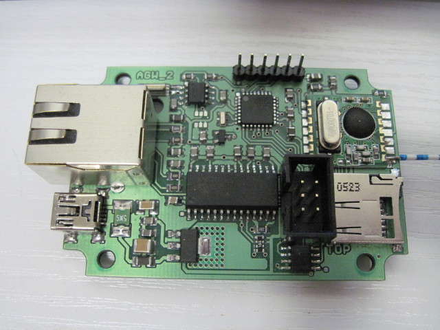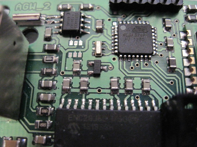 Da ich im Moment unverhofft zu etwas freier Zeit gekommen bin, hab ich selbige ausgenutzt um etwas von den Altlasten zu bearbeiten die so in der Ecke lagen. Ich hatte immer vor einen Webserver mit Propeller zu bauen, der meine Arduino basierten Sensormodule mit RFM12 Transceivern mit dem Intranet verbindet. Aber irgendwie hab ich diese Transceiver Module mit dem Prop noch nicht zum Laufen gebracht. Ende letzten Jahres fiel mir im Internet der Nanode sowie der Nanode-Gateway auf. Beide Projekte basieren auf Arduino-Technologie. Insbesondere der Nanode-Gateway gefiel mir, da er genau das bot was ich einst mit dem Propeller vorhatte, die Verbindung Intranet/Ethernet mit meinen drahtlosen Sensormodulen. Im Laufe der letzten Monate entwarf ich dann aus der Vorlage des Nanode Gateways dann einen kleinen Webserver (AGW_2) in selber Größe wie die Sensormodule und einen etwas größeren (AGW_3) der so groß ist wie mein MonoProp (Propeller Computer) und auch in ein so schickes Alu-Kleid kommt. Der AGW_2 ist fast vollständig mit SMD-Bauteilen aufgebaut, der AGW_3 allerdings bis auf drei Ausnahmen besteht aus bedrahteten Bauteilen. Zum AGW_3 kommt ein eigener Thread. Der AGW_2 (Arduinobasiertes GateWay Version 2) hat als Prozessor einen ATmega328p mit 3,3V/8MHz, Ethernet mit ENC28J60, microSD, RTC DS1338, 32kB SRAM mit 23k256, Transceiver mit RFM12 und als Schmankerl eine EEProm mit echter MAC-Adresse mit 11AA02E48. Die Spannungsversorgung erfolgt über eine USB mini B Buchse und einem 3,3V Regler mit PCB-Kühlfläche. Die RTC und das SRAM werden durch eine Batterie gepuffert.