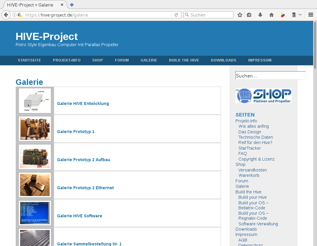 Der Hive-Online-Shop hive-project.de/shop funktioniert in meinen Browsern nicht. Wenn ich versuche, etwas in den Warenkorb zu legen, erscheint ein leeres weißes Popup-Fenster, welches vermutlich melden sollte, ob das Produkt im Warenkorb gelandet ist oder nicht. Jedoch ist dort nur am linken Rand des weißen Fensters entweder ein grüner oder ein roter senkrechter Strich und ein "Schließen"-Button, über den ich dann das Fenster schließen kann. Wenn ich dann den Link "Warenkorb" im Menü öffne, wird die Seite /shop/checkout geladen, mit dem Hive-Project-Header, dem Menü und der Überschrift "Warenkorb", sonst aber keinem Inhalt. Das gleiche passiert auch wenn ich im Menü auf "Versandkosten" klicke.